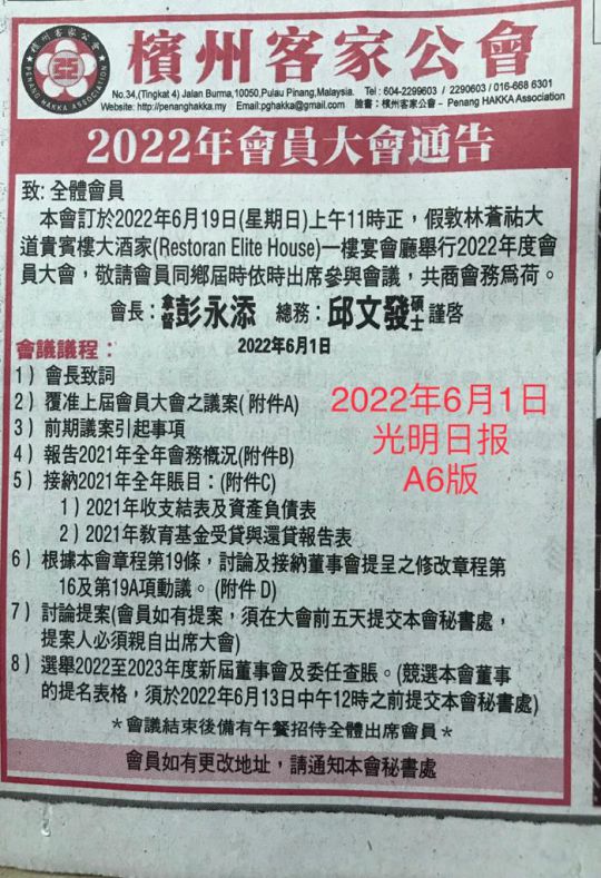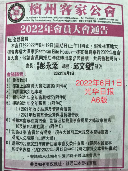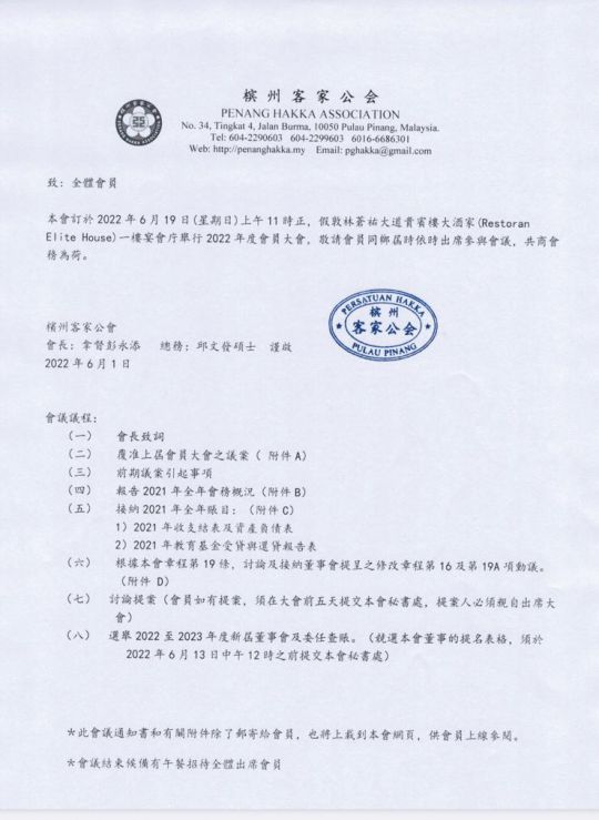 • 檳州客家公會2021年會員大會通告