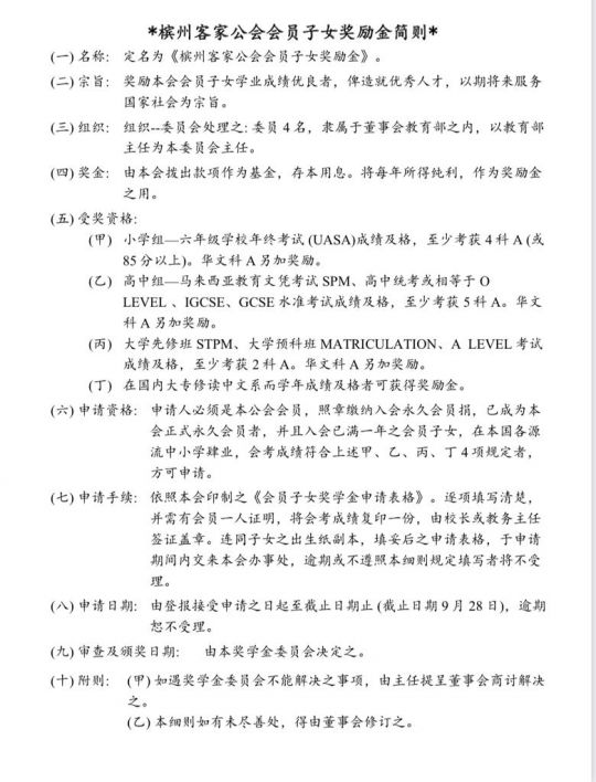 申请人必须是本公会会员,照章缴纳入会永久会员捐,已成为本会正式永久会员者,并且入会已满一年之会员子女,在本国各源流中小学肄业,会考成绩符合上述甲、乙、丙、丁4项规定者,方可申请。 |