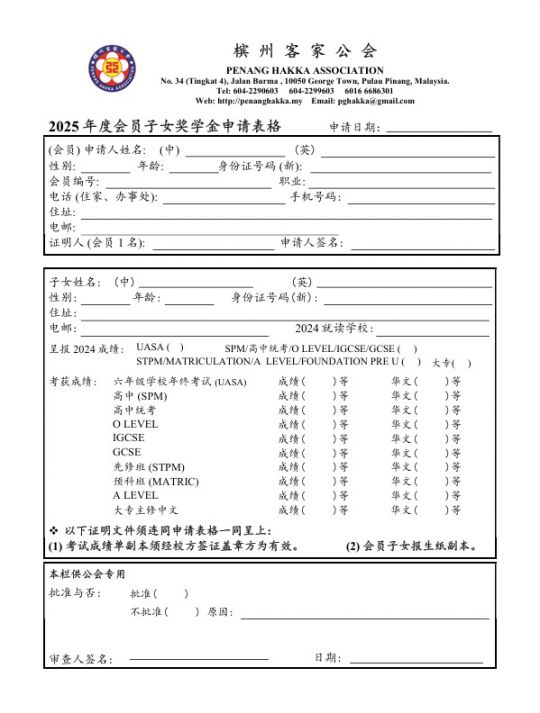 依照本会印制之《会员子女奖学金申请表格》。逐项填写清楚,并需有会员一人证明,将会考成绩复印一份,由校长或教务主任签证盖章。连同子女之出生纸副本,填妥后之申请表格,于申请期间内交来本会办事处,逾期或不遵照本细则规定填写者将不受理。 |