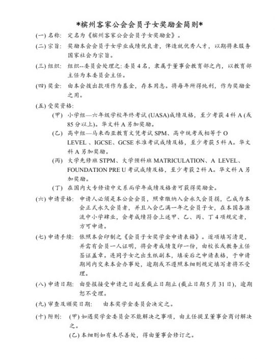 *槟州客家公会会员子女奖励金简则*