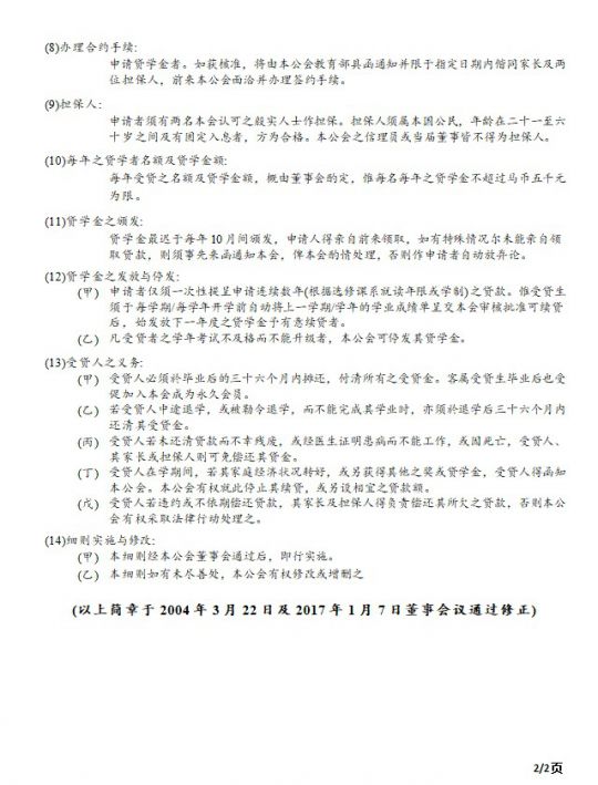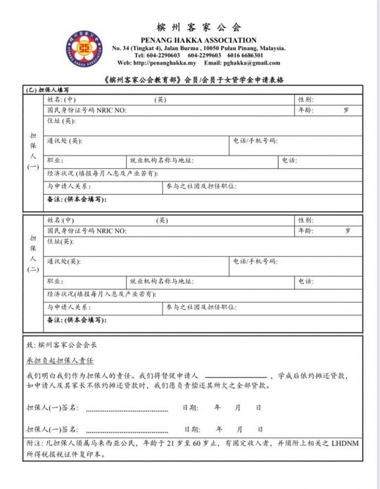 申请贷学金者。如获核准,将由本公会教育部具函通知并限于指定日期内偕同家长及两位担保人,前来本公会面洽并办理签约手续。
