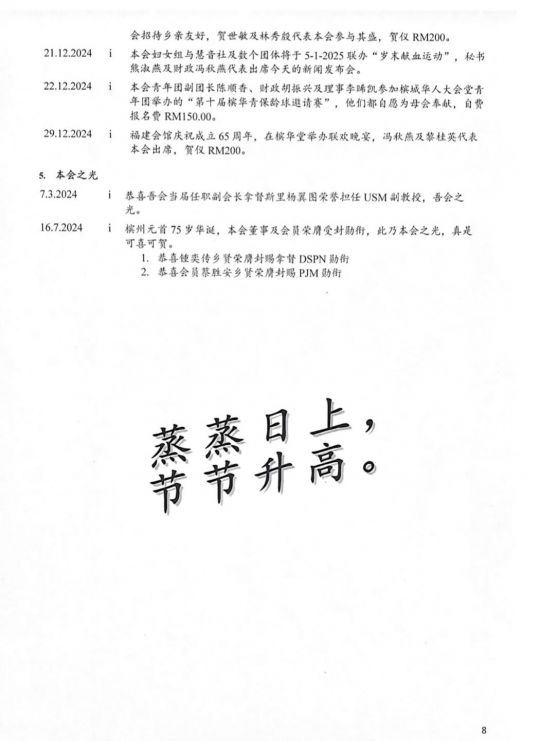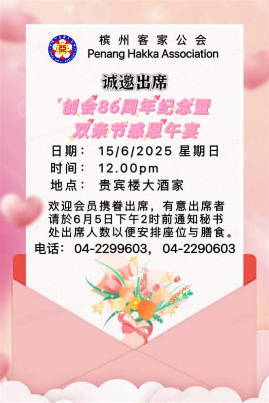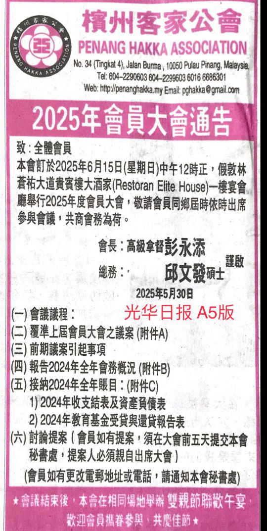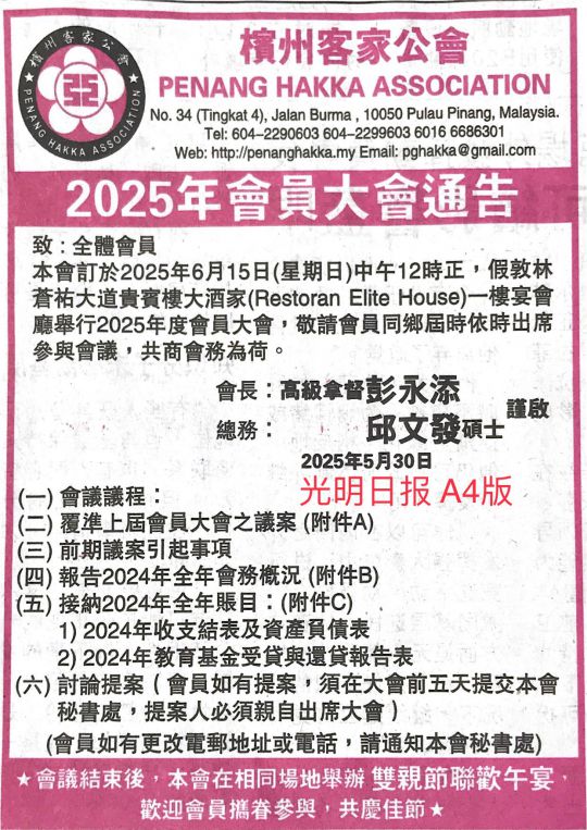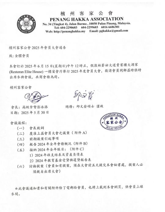 本會訂於2025年6月15日(星期日)中午12時正,假敦林蒼祐大道貴賓樓大酒家(Restoran Elite House)一樓宴會庁舉行2025年度會員大會,敬請會員同鄉屆時依時出席參與會議,共商會務為荷。